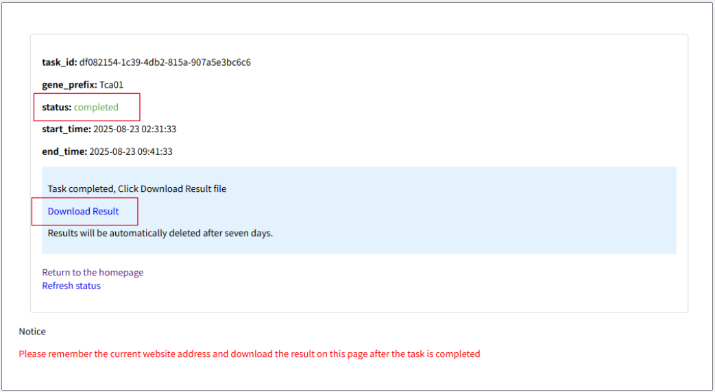Download Result Upon completion (status: 'Completed'), click 'Download Result' to obtain a .zip folder containing three result files: predicted amino acid sequences (.pep), nucleotide sequences (.cds), and annotation information (.gff). Species