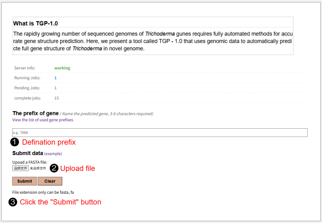 Prefix Please determine the gene prefixes that range from 3 to 6 characters as the identifier (ID) for gene prediction. (e.g., T069, FJ059) Gene prefixes cannot be repeated Upload file Please upload your genomic file in FASTA format (.fa, or .fasta extension). The maximum file size allowed is 100MB. Submit Click "Submit" button to queue your task. A tracking link will be generated, allowing you to monitor real-time progress (Pending, Running, Completed, or Failed) and download the results directly from this page.