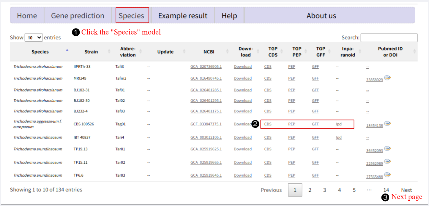 Click 'CDS', 'PEP', or 'GFF' for the corresponding species to download: Additionally, we performed comparative analysis of predicted genes versus reporter genes using the InParanoid tool. Click 'ipd' to obtain relevant results. Notice: The TGP pipeline utilizes Augustus trained on Fusarium species. Owing to the close phylogenetic relationship between Fusarium and Hypocreales, this pipeline is also suitable for gene prediction in fungal species within the Hypocreales. |
